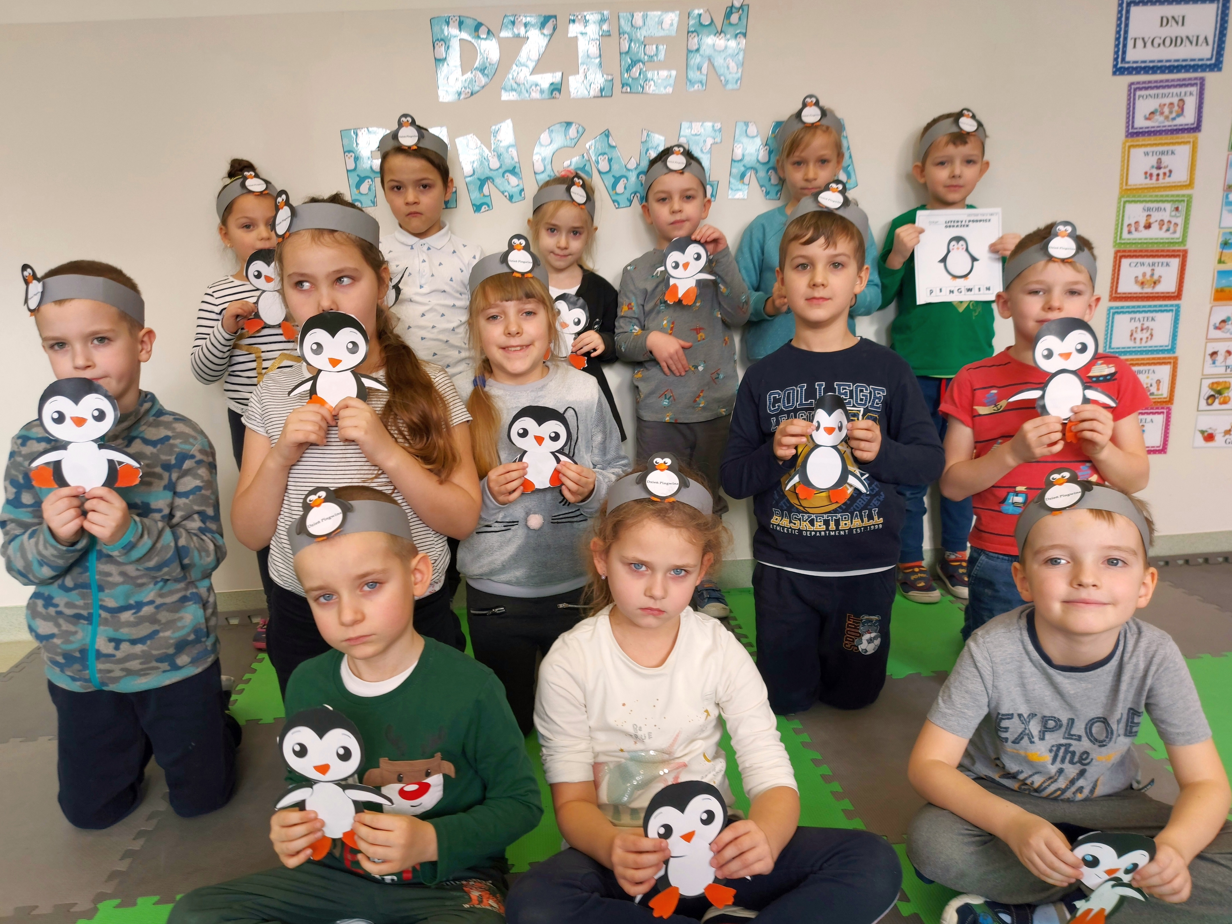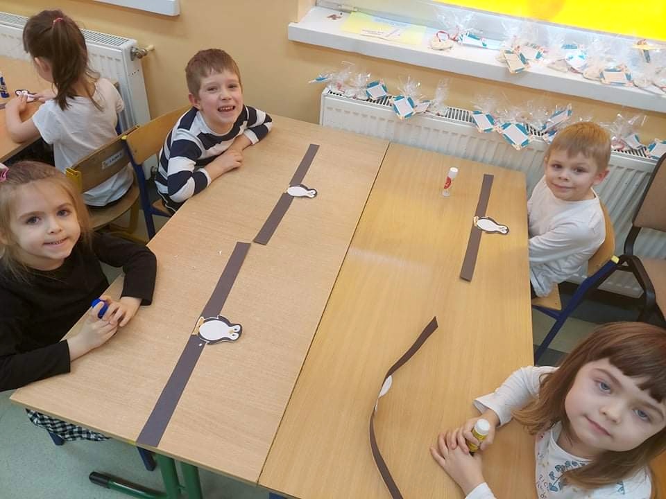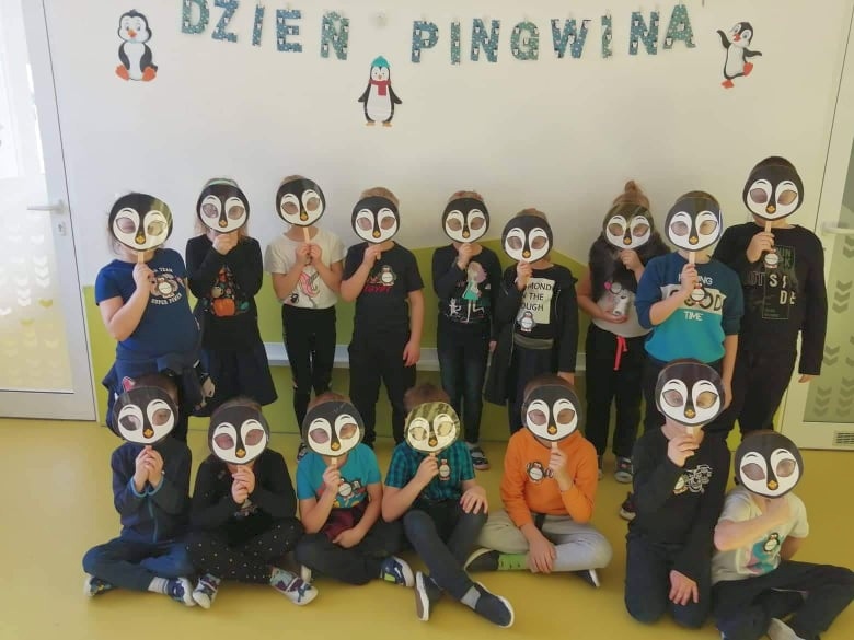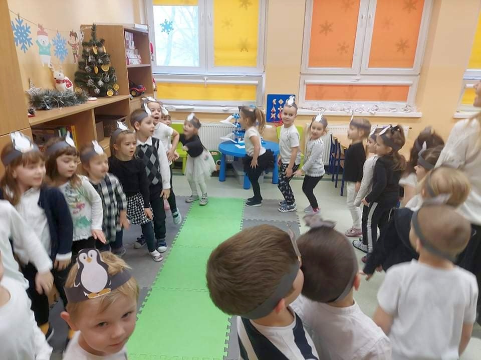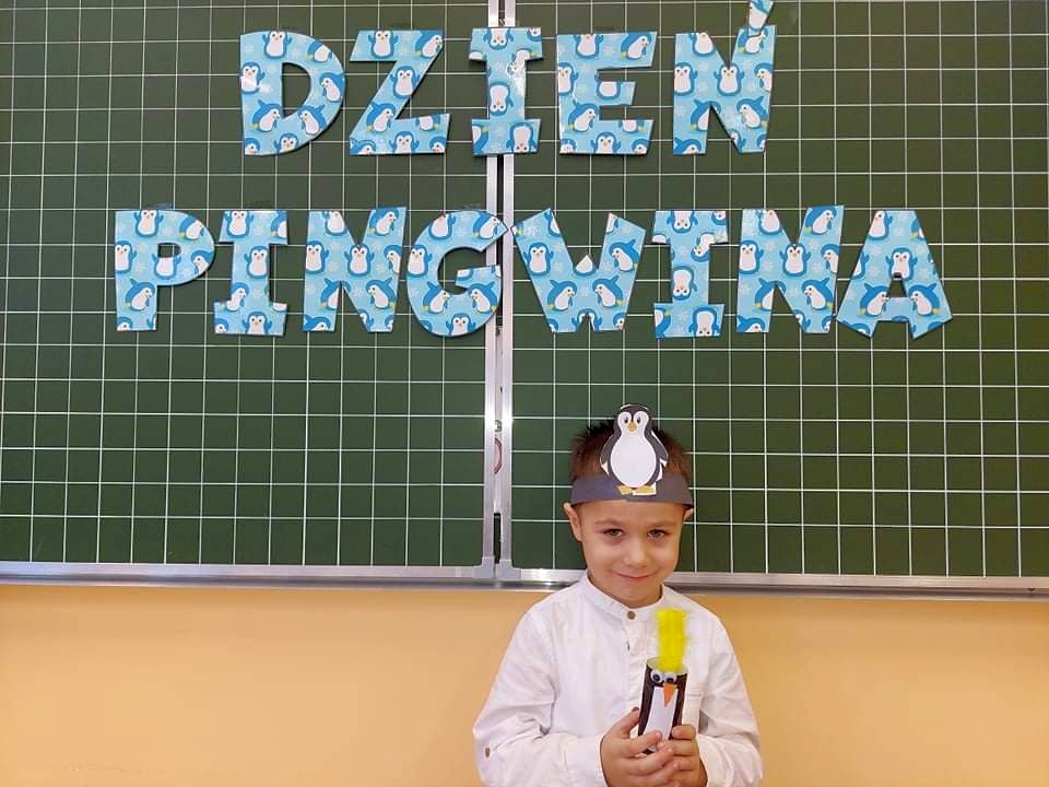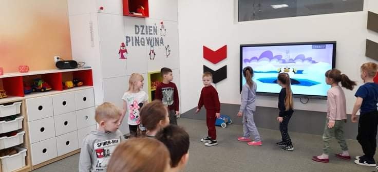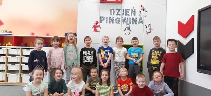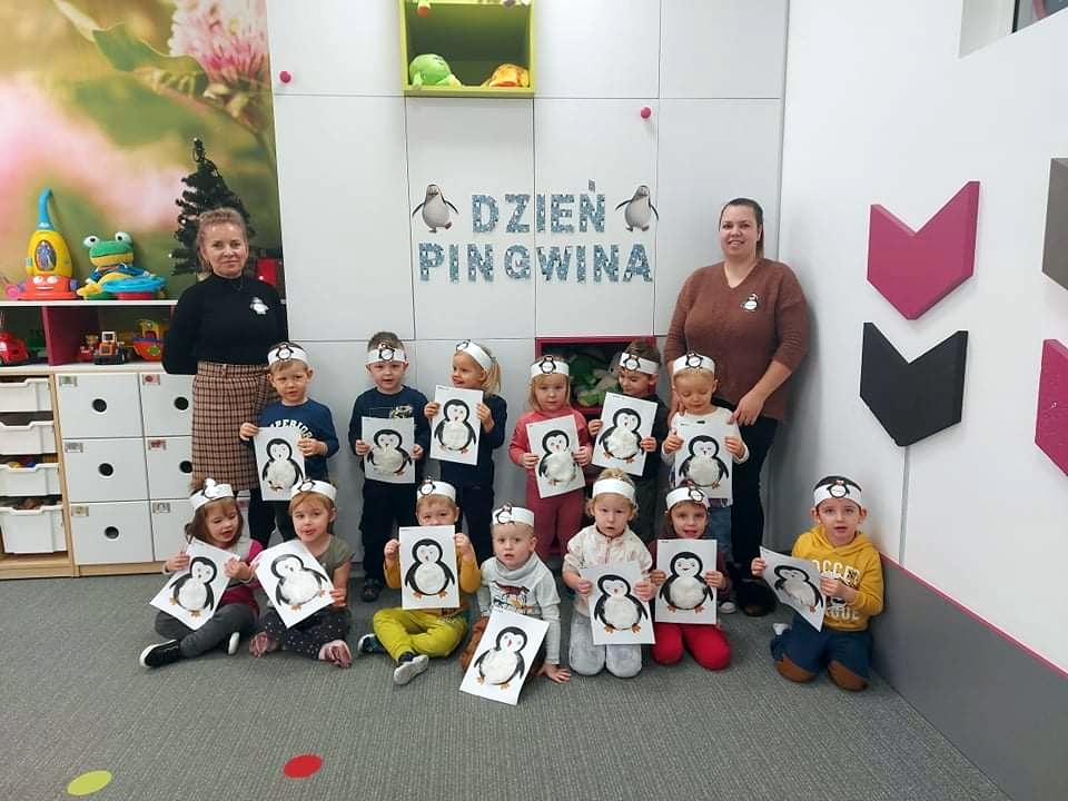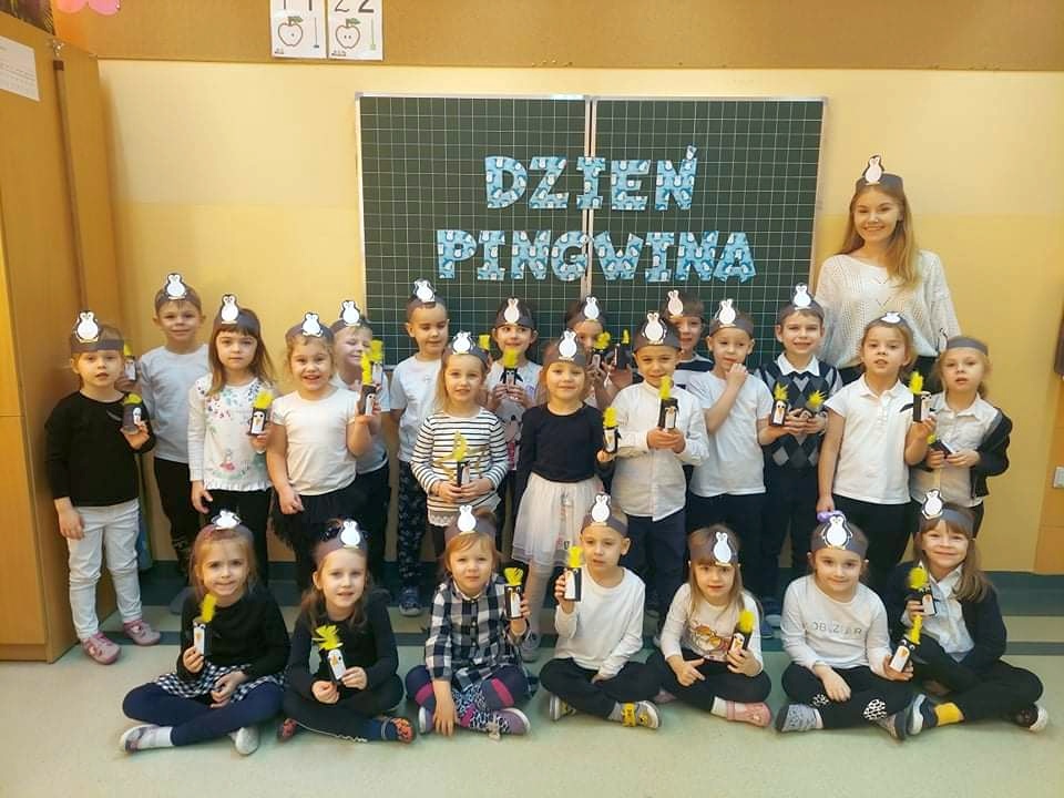 W kalendarzu to święto wypada 20 stycznia. Tego dnia dzieci w każdej grupie poznały zwyczaje i ciekawostki z życia tych sympatycznych zwierzaków. Rozwiązywały zadania matematyczne, szukały odpowiedniego cienia pingwinka, podpisywały ich postacie, szukały odpowiedniej drogi w labiryncie. Z uwagą obejrzały film, który przybliżył im życie niezwykłych ptaków zagrożonych wyginięciem. Na zakończenie dnia przedszkolaki wykonały piękne prace plastyczne przedstawiające różne gatunki tych nielotów żyjących na półkuli południowej. Dużo radości wszystkim sprawił pingwini taniec.